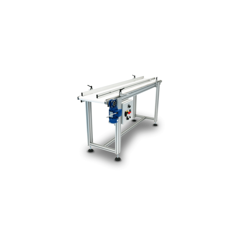 Longueur sur demande Largeur de bande jusqu'à 1000 mm Pieds réglables Entrainement par motoréducteur ou tambour moteur Bande lisse, aggripante, à tasseaux... Finition : galvanisé, aluminium ou peinture RAL au choix