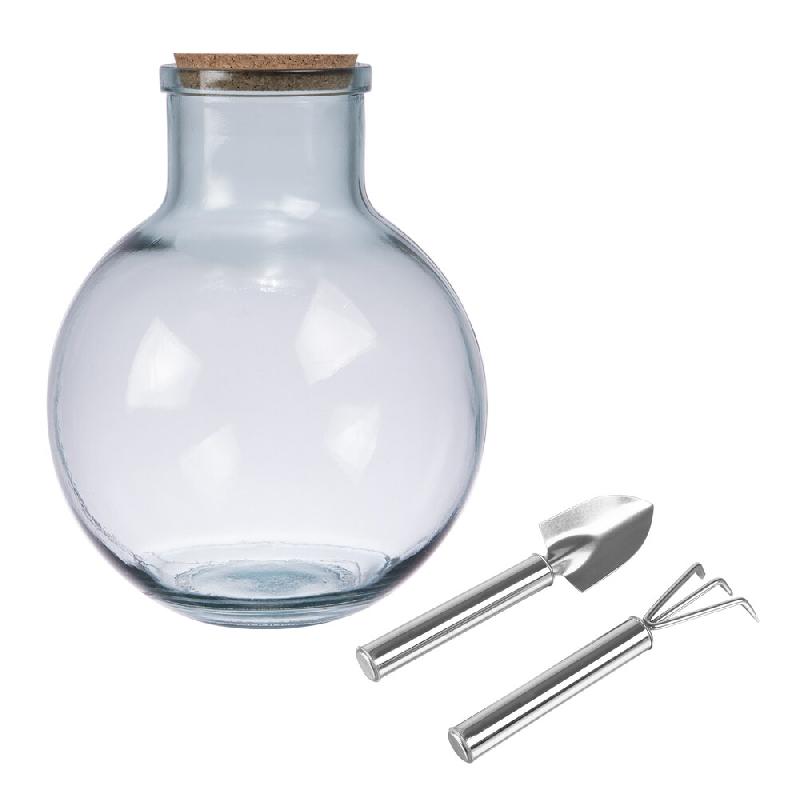 Ce magnifique terrarium en verre recyclé dont le bouchon est en liège est le cadeau idéal, à la fois décoratif et vivant ! Concevez votre mini jardin d'intérieur quasiment autosuffisant. Le terrarium mesure 31 cm de hauteur, il est fourni avec une pelle et un râteau.
