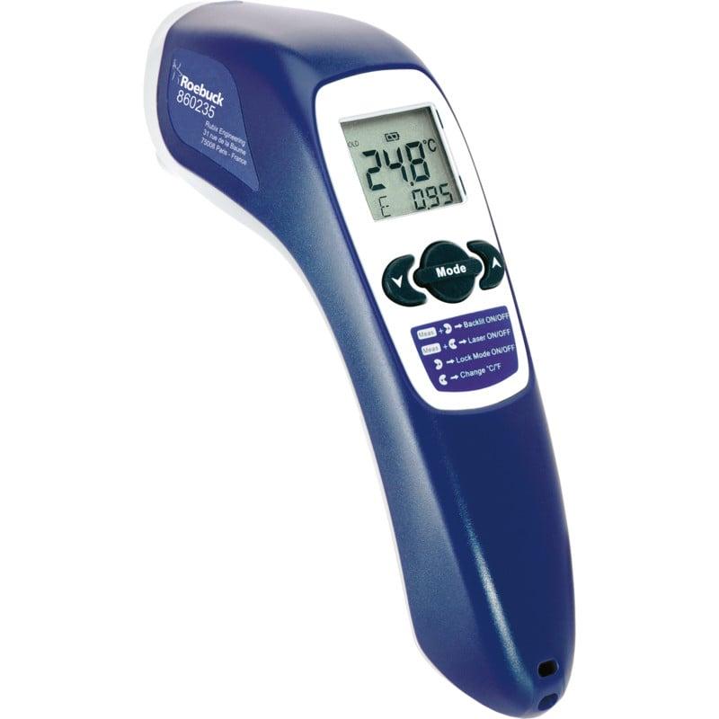 THERMOMETRE INFRAROUGE - ROEBUCK | 860235Description outillage | THERMOMETRE INFRAROUGE - ROEBUCK | 860235Appareil avec mémoire valeurs Min/Max avec fonction d’alarme, émissivité réglableet calcul de la valeur moyenne.Disposant d’un raccord pour une sonde de type K, il convient pour des utilisationsen milieux industriels, ateliers automobiles, installations chauffage, refroidissement/climatisation et pour les électriciens.Indicateur : LCD rétro éclairé.Détecteur : thermopile.Optique de mesure 12 :1.Pointeur laser : à activer.Plage de mesure : -60.500°C, -76.932°F par infrarouge.64.1400°C, -82,3.1999°F avec sonde K.Emissivité : prédéfi nie sur 0,95 mais réglable de 0,10 à 1,00 (par palier de 0,01).Résolution : 0,1° (-9,9 – 199,9°).Temps de réponse :Arrêt automatique : Après 10s.Fonction Data Hold : OUI.Température de service : 0.50 °C, 32.122°F.Humidité de l’air : 10-90% HR.Boîtier Plastique ABS résistant aux chocs et ruptures.Dimensions : 49 x 133 x 146mm.Poids : 222 g.Alimentation 2 x1,5V AAA, LR03.Sonde K (Plage de mesure de -50°C à +200°C), piles et sacoche de transportcomprises.GARANTIE 2 ANS.Garantie et provenance des produits ROEBUCK | Marque propre de Master-Outillage