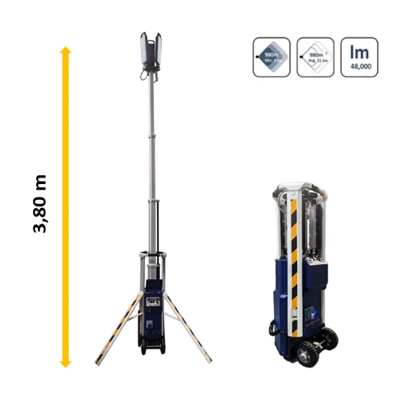 Tour d'éclairage portable à utiliser dans les situations où il est nécessaire d'éclairer temporairement un chantier pendant les heures nocturnes. - CARACTÉRISTIQUES OPTIQUES - Source lumineuse : LED - Fonctionnement : Dimmable - Fonctionnement : 4 niveaux de luminosité - Surface éclair