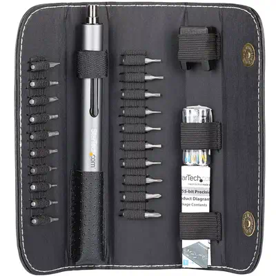 Ce tournevis électrique sans fil est l'outil parfait pour effectuer des réparations sur des appareils électroniques, incluant smartphones et ordinateurs portables. Il se compose de 55 embouts, d€™un magnétiseur/démagnétiseur, et est rangé dans une mallette robuste. - Multitude d'Embo