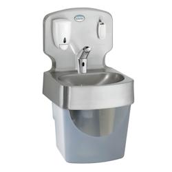 Commande fémorale avec corbeille à papier crochetable sous la cuve, brosse à ongles et distributeur de savon manuel (500 ml) monobloc avec dosseret intégré cuve dim. 350x275x80 mm bouton poussoir à l'avant pré - mélangeur EC - EF avec clapets - Marque : Tournus - Matière : plastic - Dél