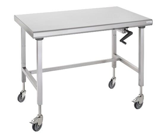 Table inox centrale Ergonomix,dimensions 1800 x 700 mm hauteur réglable de 800 à 1100 mm, plan de travail en inox épaisseur 15/10ème de mm, dessus doublé par panneau stratifié avec sous-face aluminium, bord avant et bord arrière rayonnés avec bords écrasés anti-coupures, piétement en tube inox carré 40 x 40 mm avec entretoises et barre longitudinale. Système hydraulique (course 0-300 mm) commandé par une manivelle escamotable. 4 roues diamètre 125 mm dont 2 à frein. Charge maxi 250 kg.