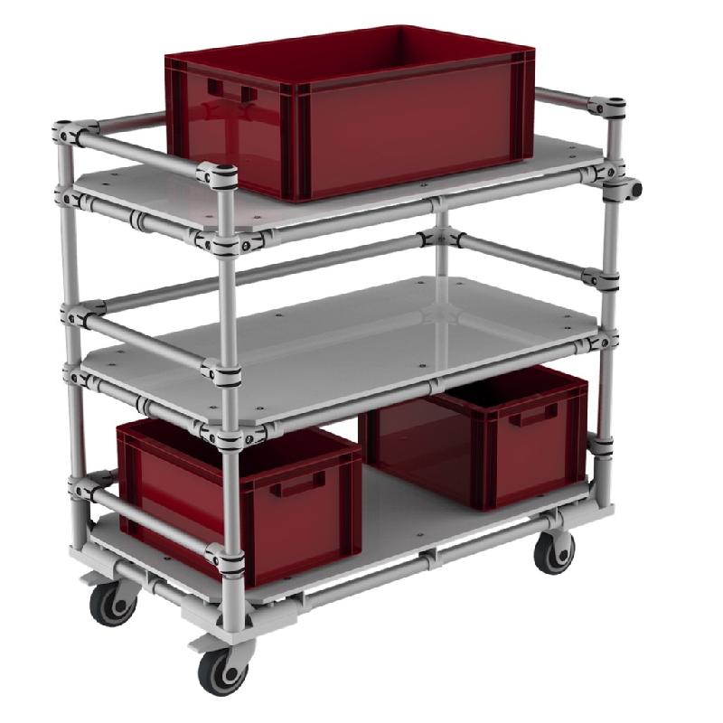 Chariot multi niveaux - Charge utile : 500 Kg. - Dimensions : Base : 1 000 x 700 mm ou 1 200 x 800 mm, hauteur 1 420 mm ou 1 780 mm. - Plateau : Bois mélaminé ou plateau bois recouvert de caoutchouc amovible. - Roues : Ø 200 mm. -