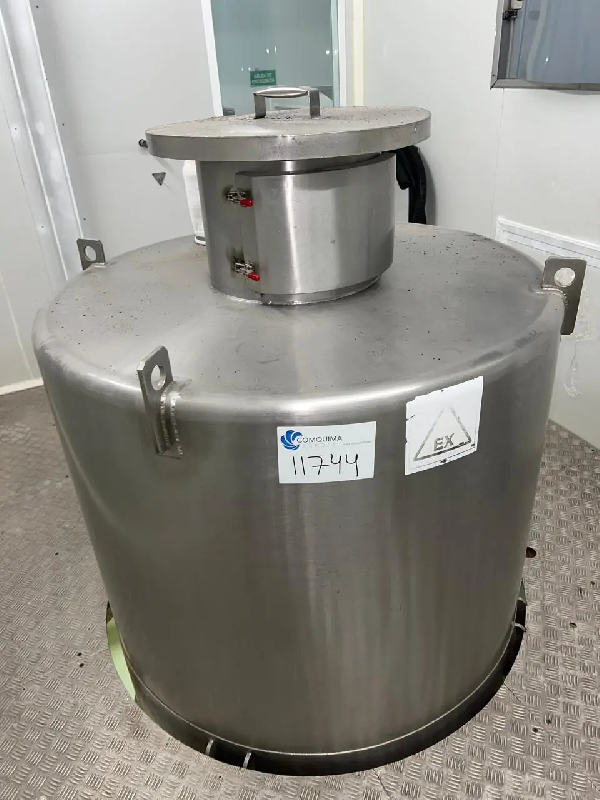 Cuve verticale en acier inoxydable 316, d'un volume de 510 litres, avec agitation. - Fond supérieur plat avec couvercle. - Fond Klopper avec sortie DN30. - Agitation de type hélice tripale. - Moteur : 037 kw à 1366 rpm. - Sur 3 pieds. - Volume - Capacité totale - 510 L - Matériel - Ac