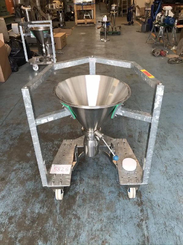 Trémie d'alimentation en acier inoxydable. Supporté sur une structure avec roues en acier inoxydable. Avec vanne papillon manuelle au refoulement. Dimensions : Diamètre d'entrée : 490 mm Diamètre de sortie : 125 mm Dimensions de travail : Hauteur : 950 mm Largeur : 790 mm Profondeur : 700 mm MatérielAcier inoxydable 316/316LÉtatDans son étatFabriqué parFabricant inconnu
