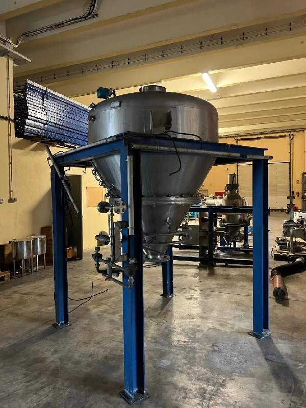 Trémie tampon ATEX en acier inoxydable de la marque E.BACHILLER avec agitateur.Année : 2003. Sur 4 cornières.Moteur : 4 kW - 1435 tr/min - 50 Hz - 380 V. - Raccords : - Trou d'homme : Ø 440 mm - Bride supérieure : Ø ext. 315 mm - Brides inférieures : Ø ext. 620 mm et Ø ext. 340 mm -