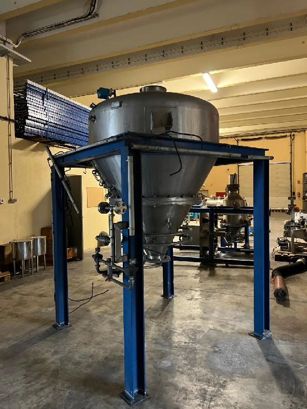 Trémie à solides en acier inoxydable, d'une capacité de 1 800 litres. Diamètre : 1500 mm Hauteur droite : 400 mm Diamètre inférieur : 200 mm Diagonale : 550+700+100 mm MatérielAcier inoxydable 316/316LInformations pour le transportLongueur2000 mmLargeur2000 mmHauteur3100 mmÉtatDans son étatFabriqué parFabricant inconnu