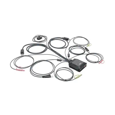 Switch KVM DisplayPort USB 2 ports avec ses câbles pieuvres combinés Commute le signal graphique DisplayPort, la souris et le clavier USB, périphériques USB 2.0, haut - parleurs stéréo et microphone, entre 2 ordinateurs. Spécifications : - Supporte les souris et claviers USB - Partage USB 2