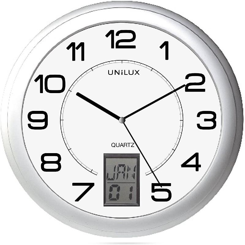 Unilux Instinct Horloge Murale Systeme Quartz avec Changement d'Heure Automatique et Dateur numerique, Diamètre 30,5 cm Gris metal - argenté 100340853