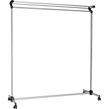 Portant mobile et léger, son format est pratique pour transporter et ranger vos vêtements. Equipé de 4 roues pivotantes de Ø 50 mm en plastique noir. Les roues ne possèdent pas de freins. Hauteur : 1575 mm. Charge : 100 kg. Coloris : zinc. Livré dans un emballage à plat, à monter soi - même