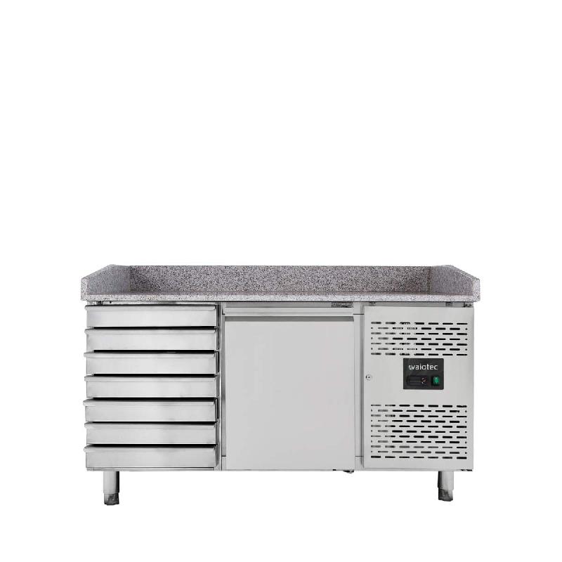 Porte et 7 tiroirs Plage de température : - 2 à +8 °C Avec un plan de travail en granit noir de 30 mm pour conteneurs, étagères, etc. EN 600 x 400 mm. Dimensions du produit (L x P x H) : 1510 x 800 x 1000 mm Version : 1 porte et 7 tiroirs Porte réfrigérée Tiroirs non réfrigérés pour morc