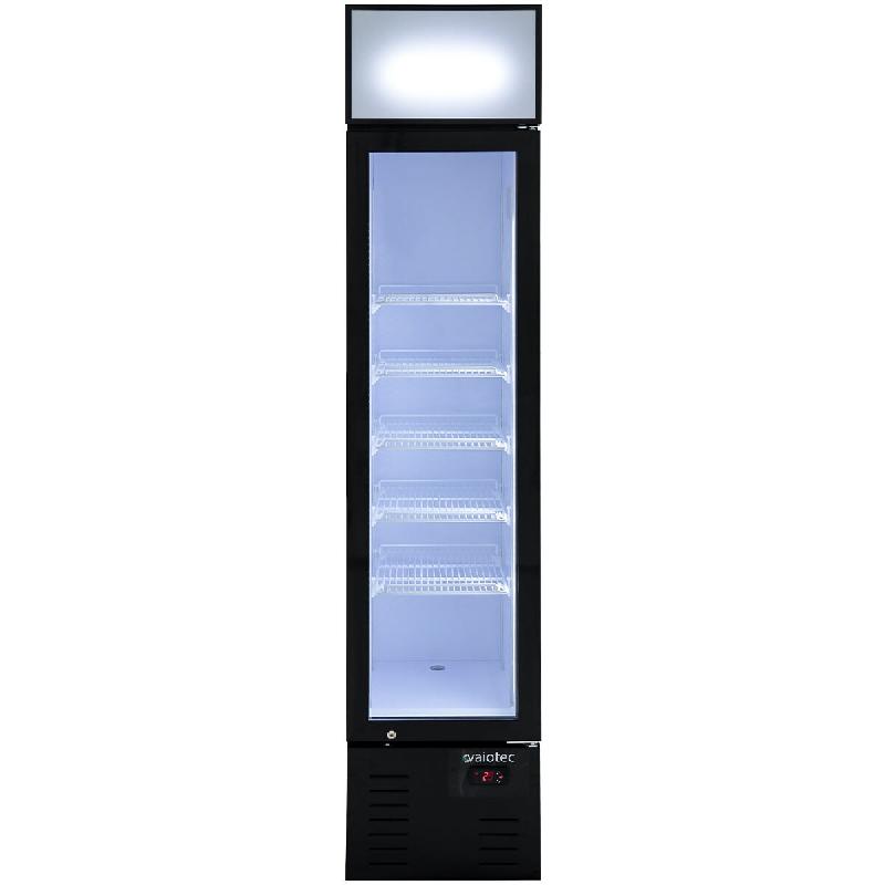 Réfrigérateur à porte vitrée, plage de température : +2 à +10 °C, avec panneau lumineux LED et thermostat numérique Carel. Dimensions du produit (L x P x H) : 390 x 480 x 1888 mm. Version : 1 porte vitrée avec panneau lumineux, extérieur noir et intérieur blanc. Plage de température : +2 à +10 °C, thermostat numérique Carel, ventilation assistée, éclairage intérieur LED, porte vitrée à fermeture automatique (double vitrage), verrouillable. Extérieur en acier inoxydable thermolaqué, joints clipsables faciles à nettoyer, 2 pieds et 2 roulettes. Angles intérieurs arrondis pour un nettoyage facile. Inclus dans la livraison : 5 clayettes revêtues de Rilsan / Dimensions : 278 x 328 mm. Caractéristiques techniques : Plage de température : +2 à +10 °C, température ambiante max. : +25 °C, fluide frigorigène : R600a, classe climatique : 3, volume brut : 162 litres, volume net : 155 litres.