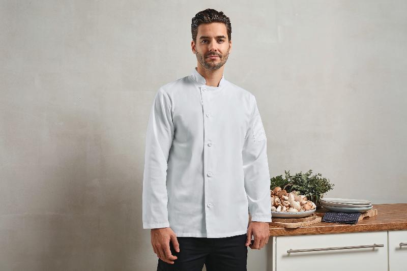 Veste chef cuisinier manches longues 'Essential' - Premier PR901 - polyester/coton, col mandarin, lavage industriel