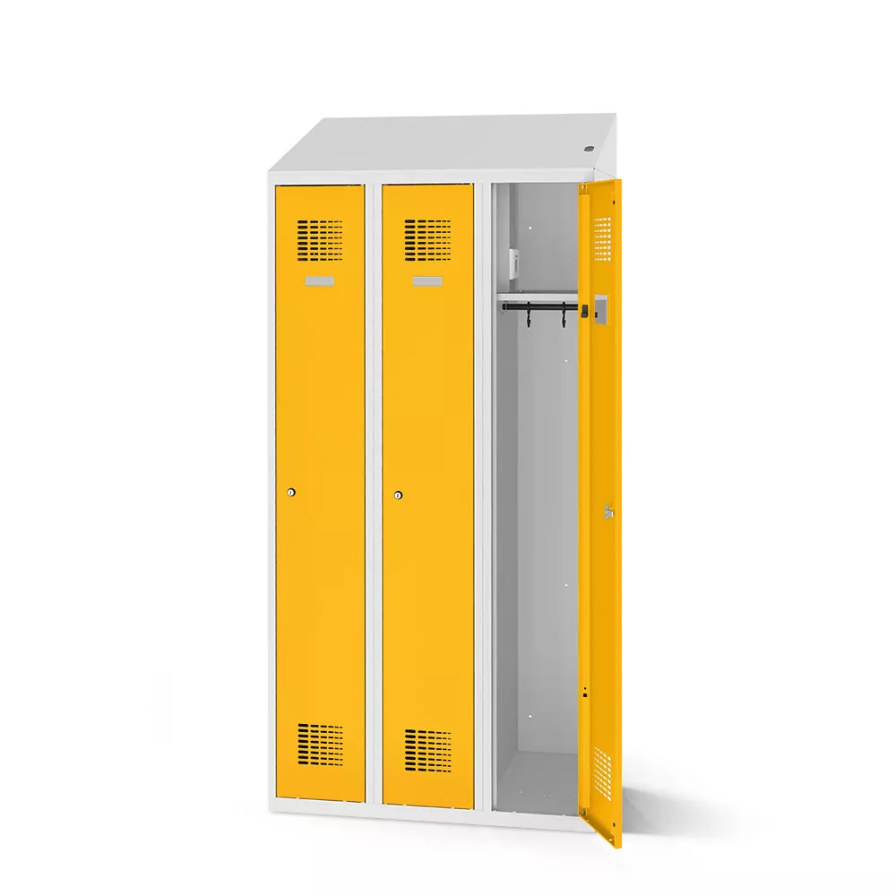 Le vestiaire métallique est équipé d’un toit incliné sous lequel est installé le système électrique. Le système électrique intègre un fusible thermique, une protection contre les surtensions et un témoin LED indiquant l’alimentation en électricité.
