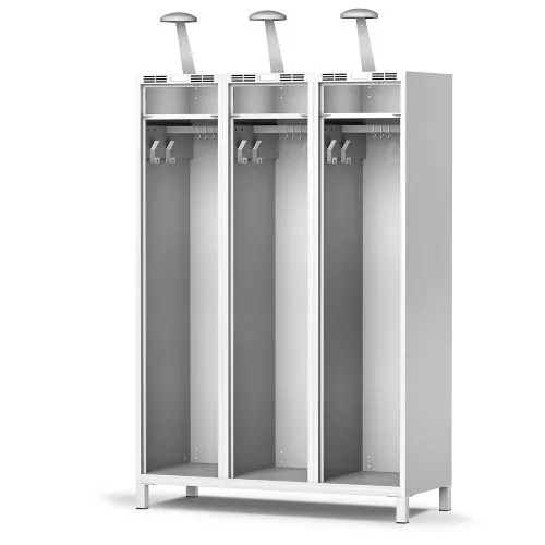 • Une centrale de ventilation et de chauffage - implantée sous l'armoire ou dans un module - central (pour les blocs de plusieurs - vestiaires) permet une désinfection efficace - par air chaud enrichi d'ozone. - • Aucun produit chimique ni autre - consommable n'est utilisé pour as