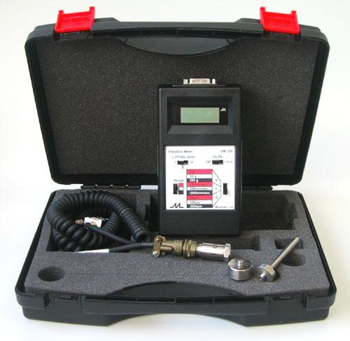 Le Vibromètre portable VM-120 est un appareil de précision adapté à la surveillance de moteurs, paliers, et autres types de machines. Un accéléromètre de précision est intégré dans une poignée en plastique qui peut accueillir de nombreuses sondes interchangeables. Elle est connectée à l'appareil principal par un câble spiralé de 1 m.