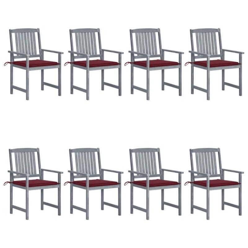 Ajoutez du confort supplémentaire dans votre espace extérieur avec cet ensemble de chaises de jardin en bois. Il est parfait pour bavarder en famille et entre amis ou tout simplement profiter des bains de soleil apaisants ! Cet ensemble de chaise d'extérieur est fait de bois d'acacia massif avec une finition lavée grise, qui est un bois dur à grains denses. Le bois d'acacia massif a également la force de supporter le poids et de résister à l'usure du temps. Cet ensemble de chaises en bois est stable, durable et résistant aux intempéries. De plus, la surface de la chaise est facile à nettoyer avec un torchon humide. Les coussins inclus offrent un confort supplémentaire. Remarque : afin de prolonger la durée de vie de vos meubles d'extérieur, nous vous recommandons de les nettoyer régulièrement et de ne pas les laisser à l'extérieur sans protection inutilement.Nettoyage : utiliser une solution savonneuse douceStockage : si possible, stockez dans un endroit frais et sec à l'intérieur. Si le produit est stocké à l'extérieur, protégez-le avec une housse imperméable. Essuyez et séchez l'excès d'eau ou de neige des surfaces planes après la pluie ou une chute de neige. Permettez une circulation d'air suffisante afin d'éviter les dommages liés à l'humidité. Couleur du coussin : rouge bordeauxCouleur de la chaise : grisMatériau de la chaise : bois d'acacia massifMatériau du coussin : tissu (100 % polyester)Dimensions de la chaise : 61 x 57 x 92 cm (l x P x H)Dimension du siège : 48 x 46 cm (l x P)Hauteur du siège à partir du sol : 43,5 cmDimensions du coussin : 50 x 50 x 3 cm (L x l x é)Chaque coussin comprend 2 jeux de cordesL'assemblage est requisLa livraison contient :8 x chaise8 x coussin Maximum 110 kg par siège.Couleur du coussin : rouge bordeauxCouleur de la chaise : grisMatériau de la chaise : bois d'acacia massifMatériau du coussin : tissu (100 % polyester)Dimensions de la chaise : 61 x 57 x 92 cm (l x P x H)Dimension du siège : 48 x 46 cm (l x P)Hauteur du siège à partir du sol : 43,5 cmDimensions du coussin : 50 x 50 x 3 cm (L x l x é)Chaque coussin comprend 2 jeux de cordesL'assemblage est requisLa livraison contient :8 x chaise8 x coussin Veuillez noter que ce produit n'est pas destiné à un usage intensif et professionnel.