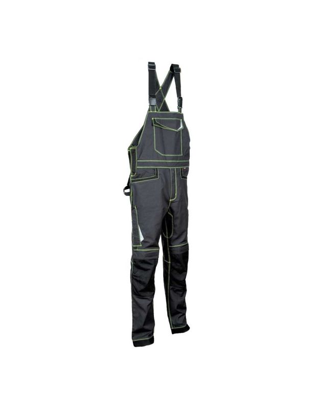 Cotte à bretelles de travail - Composition : 65% polyester / 35% coton, 245 g/m². - Caractéristiques : - Emplacements pour genouillères. - Élastique à la taille. - Nombreuses poches fonctionnelles, dont deux avec zip. - Bretelles ajustables. - Coutures renforcées. - Liserés rétro -