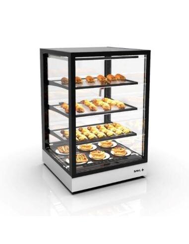 VLS1/R - Réalisation : vitrine panoramique, portillons (2 côtés) et latéraux en plexiglas. - Châssis en acier inoxydable, pieds réglables. - Flexibilité : permet le maintien à température (90°C) sans dessèchement, grâce à un système d'humidification intégré. - Chauffage : par rési
