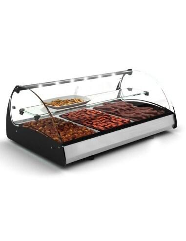 Vitrine chauffante panoramique - Bain - marie 3 GN 1/1 - Capacité : 3x GN 1/1, hauteur 150 mm - Dimensions (LxPxH) : 1020 x 602 x 680 mm - Température : 0° à +90° - Puissance : 3,5 kW - Alimentation : 230 V / 1N / 50 - 60 Hz - Poids : 55 kg - Volume : 0,68 m³ -