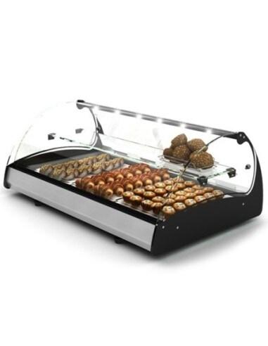 Vitrine chaude fermée avec : - Vitre bombée basculante - Éclairage halogène intégré - Plan de présentation incliné à 5° - Profondeur utile : 700 mm - Caractéristiques : - Régulation électronique de la température - Remplissage en eau automatique - Hygrométrie contrôlée - So