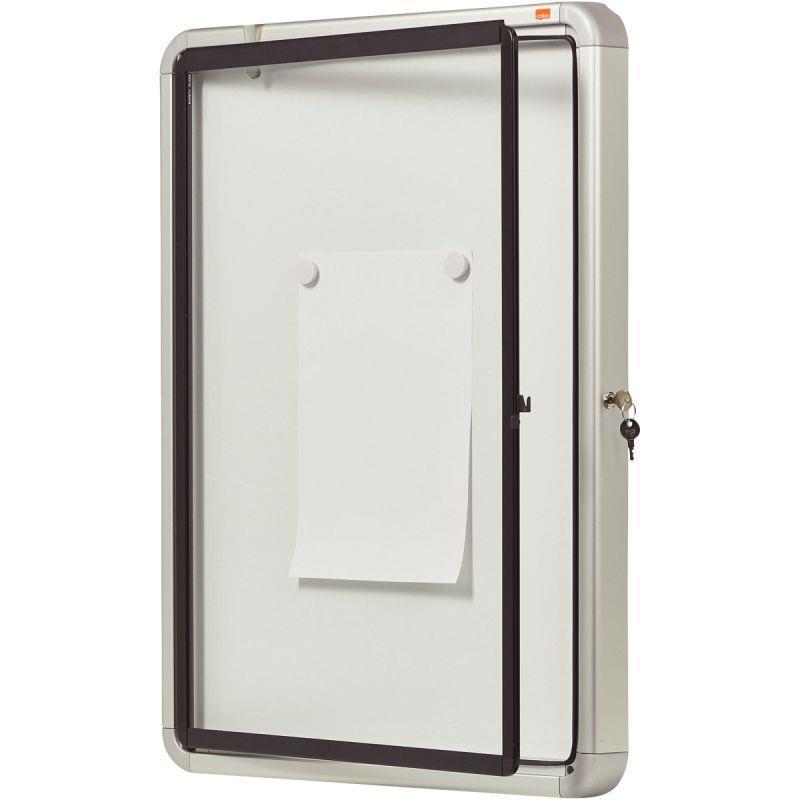 VITRINE D'AFFICHAGE A PORTE RELEVABLE murale ou sur piétement, grande capacité pour l’extérieur - Avec système d'ouverture par vérins à gaz. - Serrures de sécurité livrées avec jeu de 2 clefs. - Fond en tôle magnétique blanc (version standard). Le cadre couleur alu