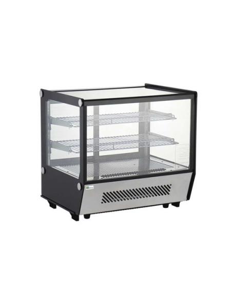 Vitrine de comptoir réfrigérée à poser avec vitre droite. - Double vitrage 4 faces, éclairage LED, étagères réglables, portes coulissantes. - Contrôleur de température numérique avec affichage digital. - Système de refroidissement ventilé. - Dégivrage automatique. - Trois niveaux