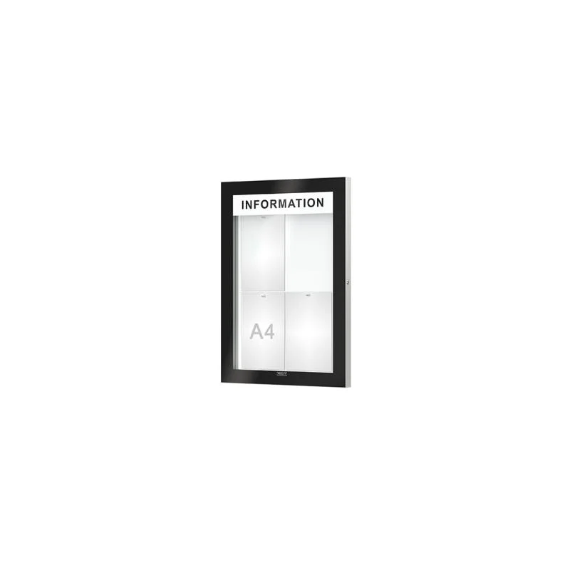 8700580 - Vitrine modèle Algol pour l'affichage de 8 feuilles A4Avec fond métallique Pour un usage en intérieur. Glaces coulissantes en verre trempé épaisseur 4 mm sur roulements à billes. Cadre aluminium anodisé avec coins arrondis injectés gris. Serrure à piston discrète permettant une