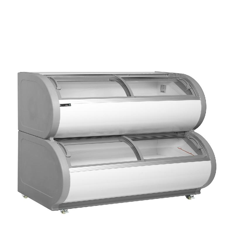 Vitrine de congélation TD500 - double niveau, grande capacité, visibilité optimisée La vitrine TD500 est une solution idéale pour la présentation et la conservation de produits surgelés en libre-service. Grâce à sa conception à deux niveaux, elle permet un agencement efficace et une capacité de stockage optimisée sans encombrer l'espace de vente. Les couvercles vitrées incurvés à faible émissivité assurent une visibilité parfaite tout en limitant les pertes énergétiques. Froid statique fiable pour produits surgelés
