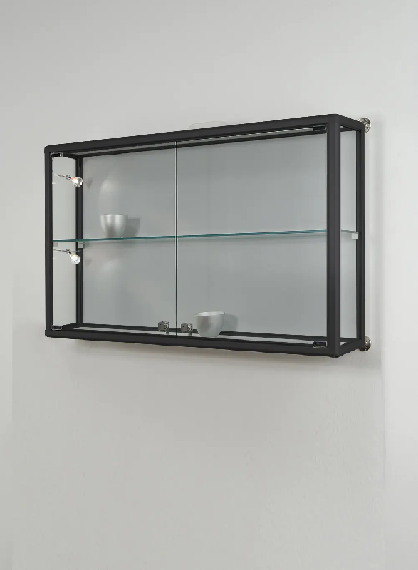 A l'intérieur, vous disposez d'une tablette réglable, vous permettant de créer une mise en scène personnalisée selon vos préférences. La structure en aluminium, de profil arrondi de 25 mm, est disponible en deux finitions : alu anodisé ou alu laqué noir. Elle ajoute une touche moderne et sophistiquée à la vitrine tout en garantissant une stabilité optimale.