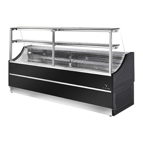 Vitrine réfrigérée de présentation avec service - arrière et réserve réfrigérée, qui permet de présenter viandes, charcuteries, denrées alimentaires emballées, fruits et boissons. Présentation élégante de vos produits grâce à sa face avant bombée et son éclairage intérieur puissa