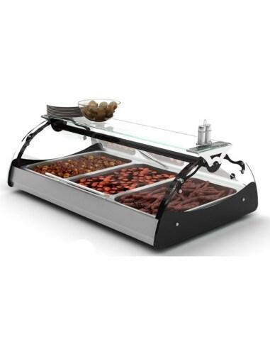 Vitrine chaude fermée avec : - Vitre bombée basculante - Éclairage halogène intégré - Plan de présentation incliné à 5° - Profondeur utile : 700 mm - Caractéristiques : - Régulation électronique de la température - Remplissage en eau automatique - Hygrométrie contrôlée - So