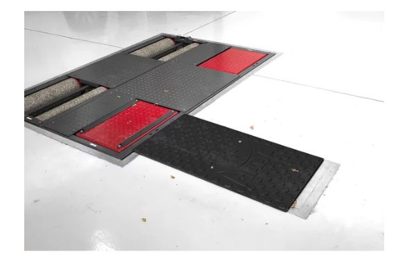 CARACTÉRISTIQUES - Charge maxi par essieu : 20 T - Moteurs : 15 KW - Vitesse de test : 2,5 km/h - Plage de mesure: 0 - 40 000 daN - Passage freinage : 80 - 280 cm - Alimentation : 400V - 50Hz - Plage de pesée : 0 à 32T - Capacité de charge : Maxi 34T/essieu - SÉCURITÉ - Garde corps