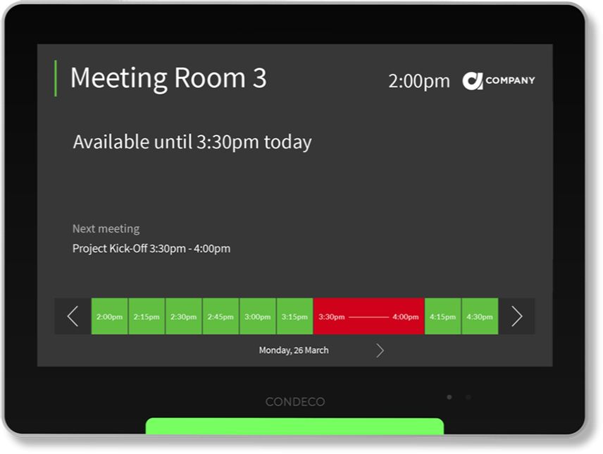Les écrans pour salles Condeco viennent parfaire vos espaces de réunion. L'écran tactile haute résolution de 10,1 pouces affiche clairement :