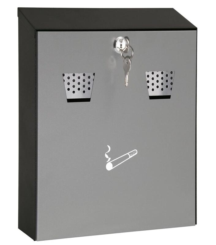 Cendrier mural avec fixation murale - Modèles de cendriers disponibles : - Cendrier mural noir : - Capot frontal basculant pour vider le cendrier avec serrure - Boîtier en tôle d'acier peint en noir - Volume : environ 1 Litre - Dimensions : L 160 x P 90 x H 200 mm - Poids : 1,1 Kg - Cendr
