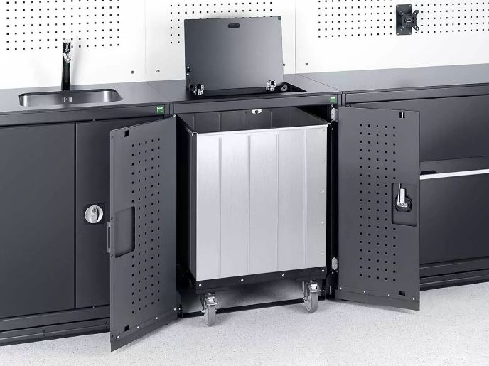 Zone à déchets - Insertion et volet pivotant - Tiroirs galvanisés à extension totale - Capacité de charge jusqu’à 200 kg par tiroir - 1 - 3 conteneurs recyclables en aluminium pour le tri des déchets et avec poignées latérales -